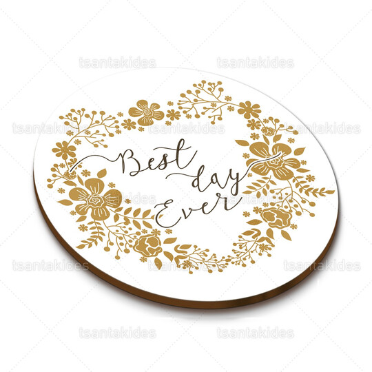 Ξύλινο σουβέρ γάμου εκτυπωμένο με λογότυπο μονογράμματα και floral χρυσό στεφάνι