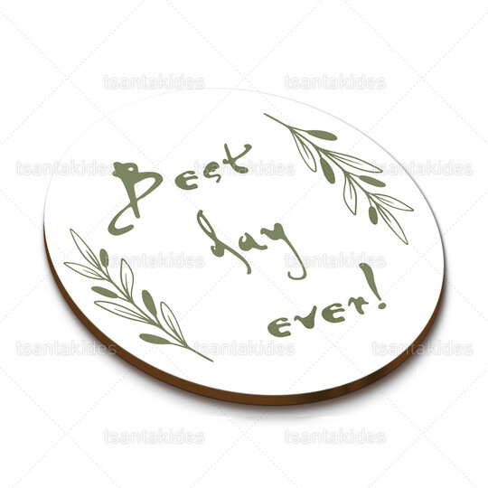 Ξύλινο σουβέρ γάμου εκτυπωμένο σε λαδί αποχρώσεις και λογότυπο η ημερομηνία με κλαδιά ελιάς