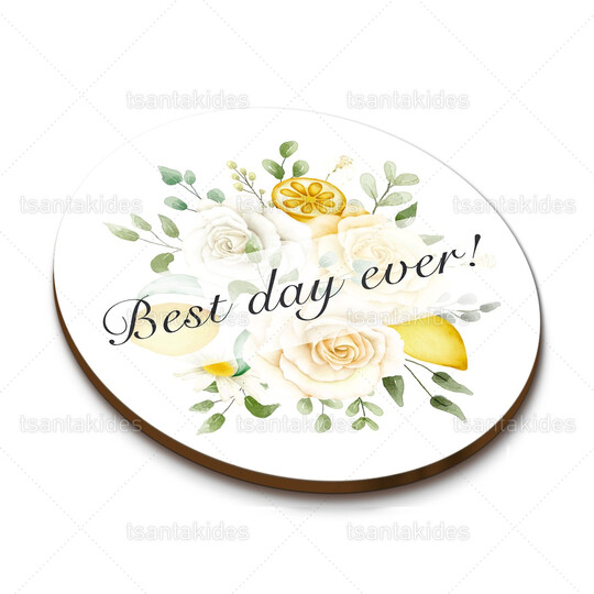 Ξύλινο σουβέρ γάμου εκτυπωμένο με floral σύνθεση με τριαντάφυλλα και λεμόνια