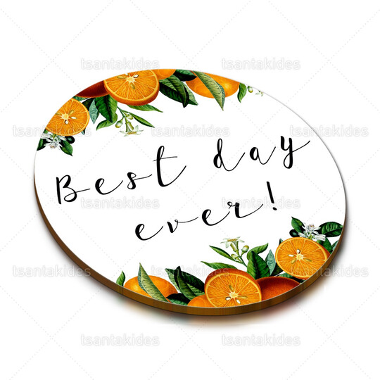 Ξύλινο σουβέρ γάμου εκτυπωμένο με σύνθεση από πορτοκάλια και λογότυπο μονογράμματα