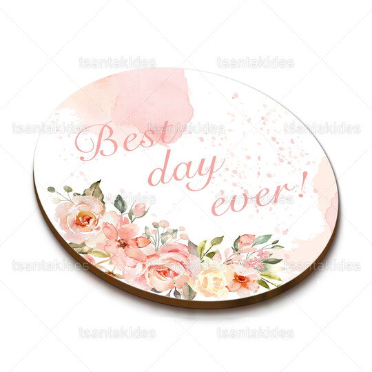 Ξύλινο σουβέρ γάμου εκτυπωμένο με floral peach αποχρώσεις και χρυσό οβάλ στεφάνι