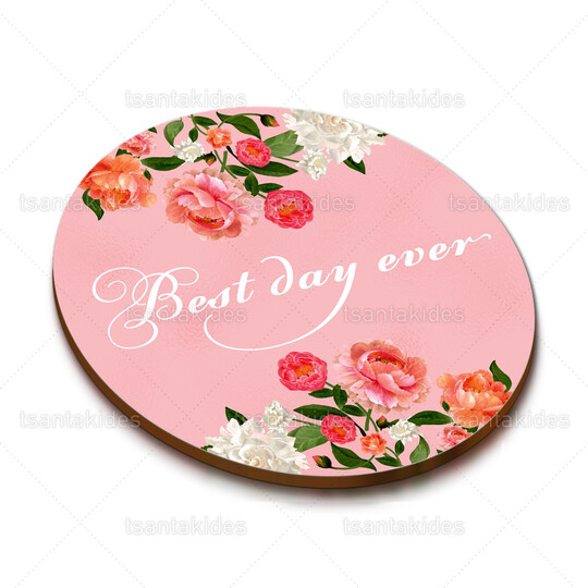Ξύλινο σουβέρ γάμου εκτυπωμένο με λογότυπο LOVE με τριαντάφυλλα και ροζ backround