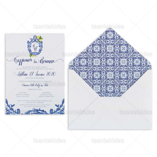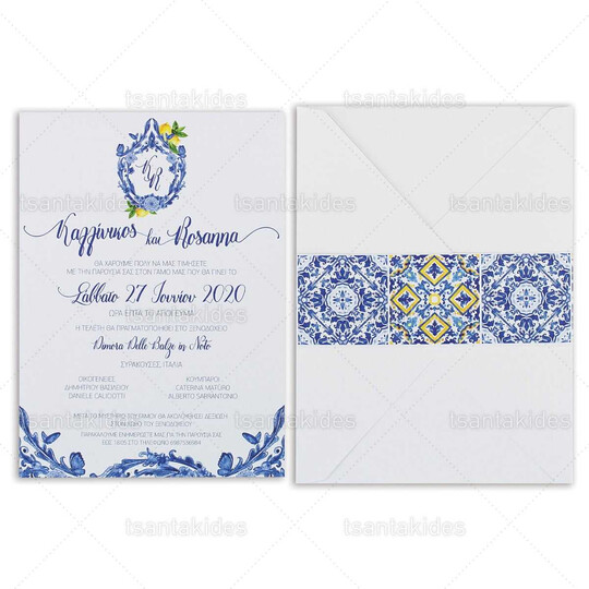 Προσκλητήριο γάμου εκτυπωμένο με θέμα Lemon & Blue Tile