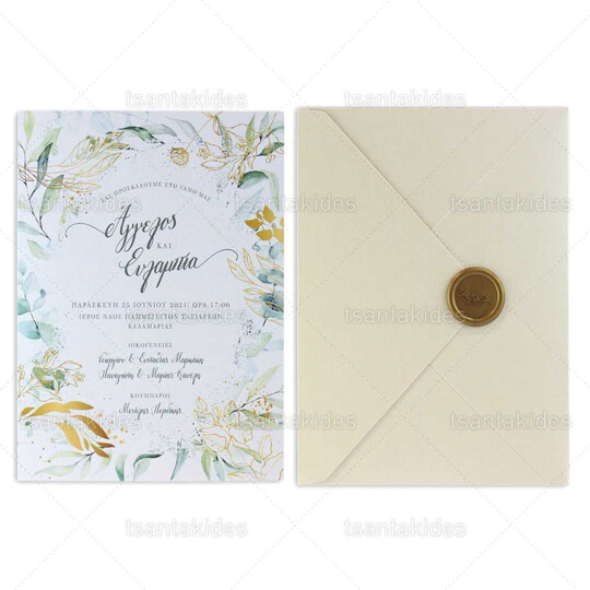 Προσκλητήριο γάμου εκτυπωμένο με θέμα  Airy Greenery and Gold Leaf