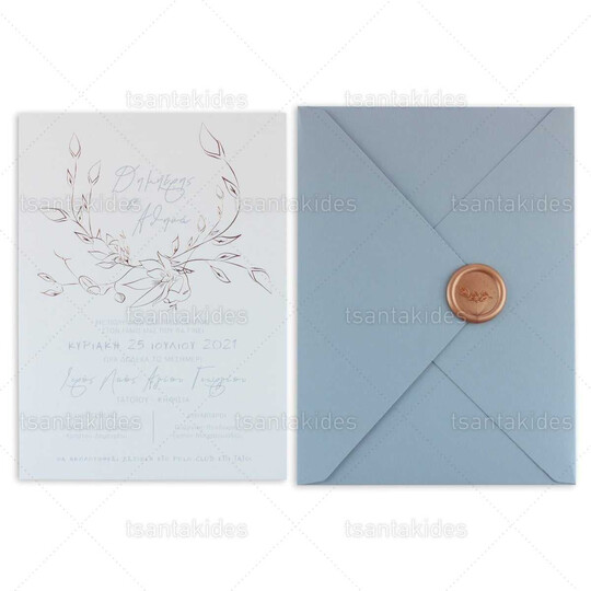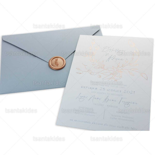 Προσκλητήριο γάμου εκτυπωμένο με θέμα Dusty Blue Rose Gold Foil