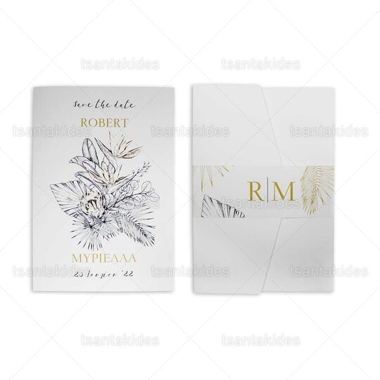 Προσκλητήριο γάμου εκτυπωμένο με θέμα  Gold And Black Tropical Flowers