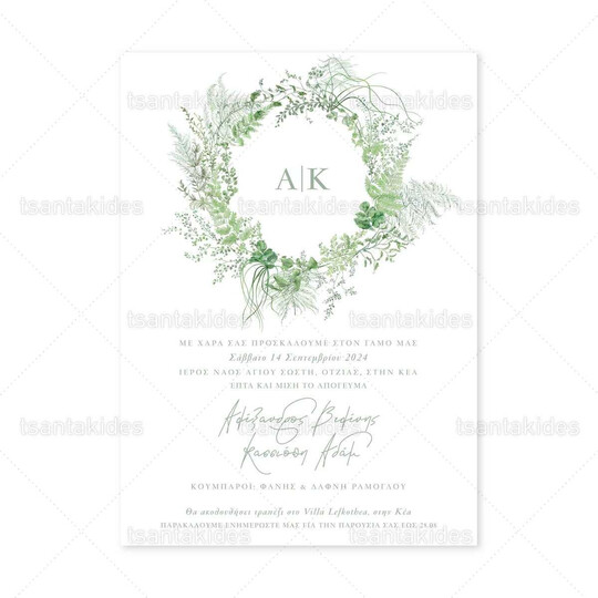 Προσκλητήριο γάμου εκτυπωμένο με θέμα Greenery Wreath