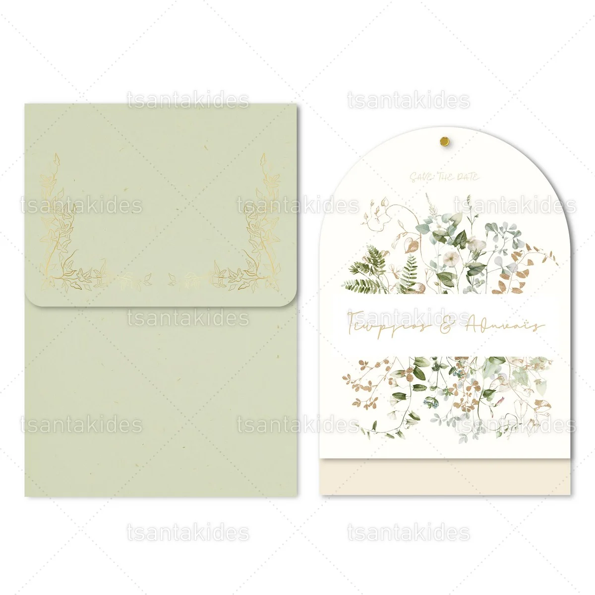 Προσκλητήριο γάμου εκτυπωμένο με θέμα Greenery Leaves.