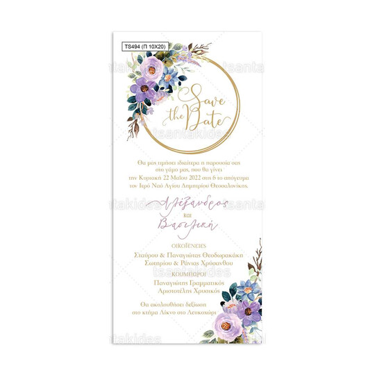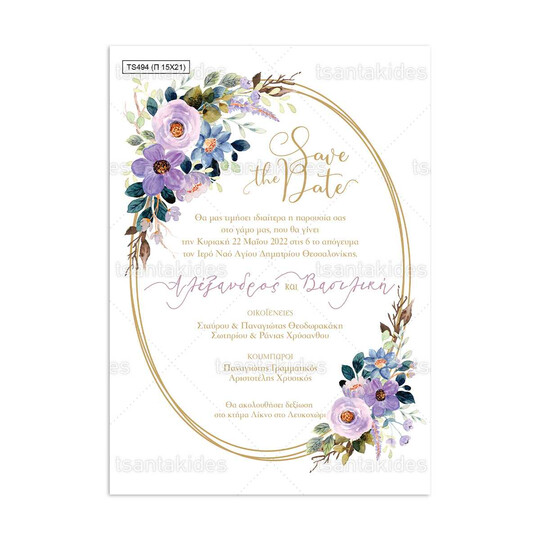 Προσκλητήριο γάμου παπυράκι εκτυπωμένο με θέμα Purple Gold Wreath