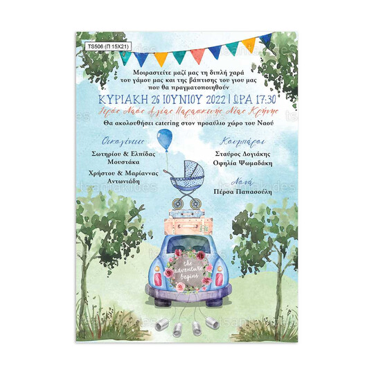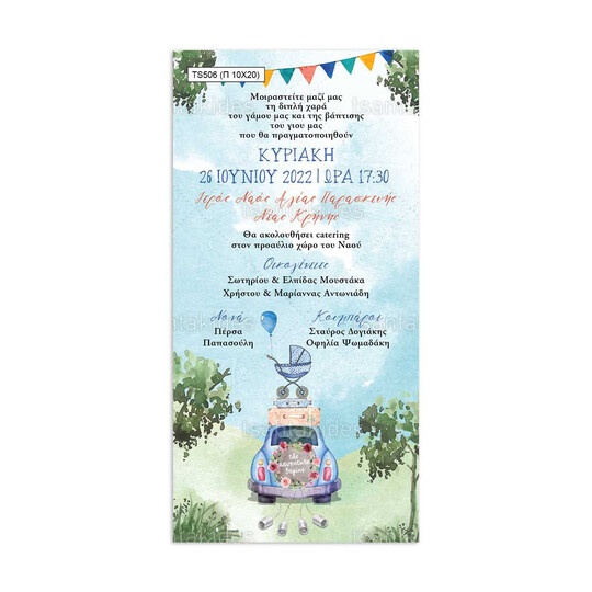 Προσκλητήριο γάμου παπυράκι εκτυπωμένο με θέμα Blue Car in Adventure