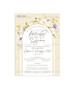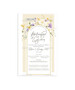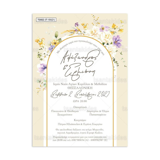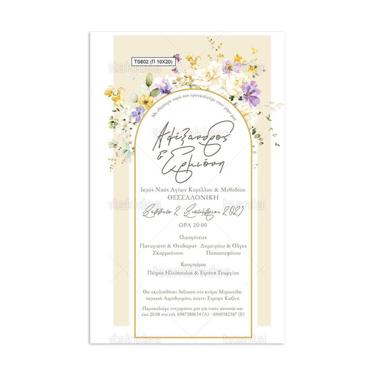 Προσκλητήριο γάμου παπυράκι εκτυπωμένο με θέμα χρυσή αψίδα και σύνθεση από pastel λιλά και κίτρινα λουλούδια