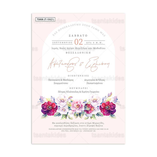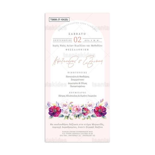 Προσκλητήριο γάμου παπυράκι εκτυπωμένο με θέμα floral διάκοσμο σε αψίδα