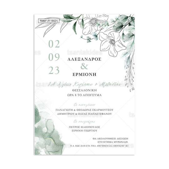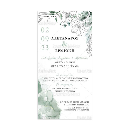 Προσκλητήριο γάμου παπυράκι εκτυπωμένο με θέμα watercolor σε αποχρώσεις του ευκάλυπτου