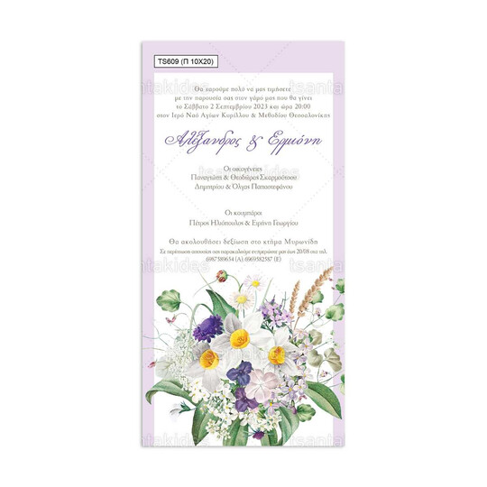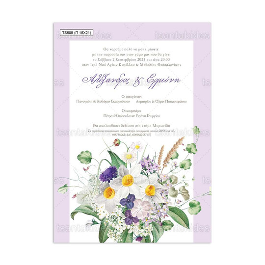 Προσκλητήριο γάμου παπυράκι εκτυπωμένο με θέμα floral μπουκέτο σε λιλά χρωματισμούς