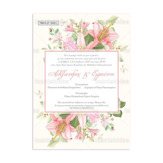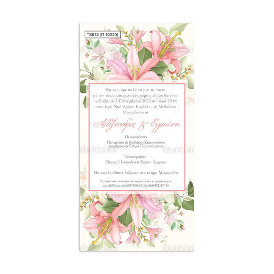 Προσκλητήριο γάμου παπυράκι εκτυπωμένο με θέμα floral σύνθεση από ροζ λίλιουμ