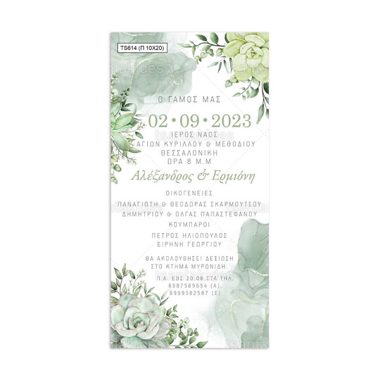 Προσκλητήριο γάμου παπυράκι εκτυπωμένο με θέμα floral σύνθεση από παχύφυτα και ευκάλυπτο