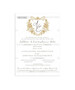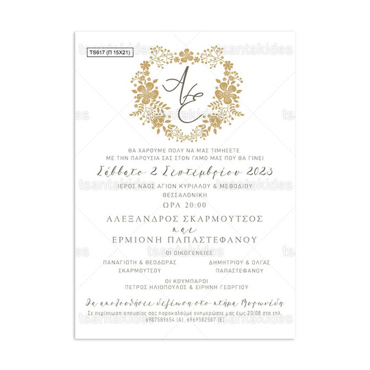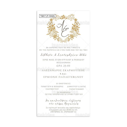 Προσκλητήριο γάμου παπυράκι εκτυπωμένο με θέμα λογότυπο μονογράμματα και floral χρυσό στεφάνι