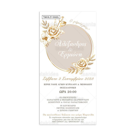 Προσκλητήριο γάμου παπυράκι εκτυπωμένο με θέμα xρυσό στεφάνι από τριαντάφυλλα