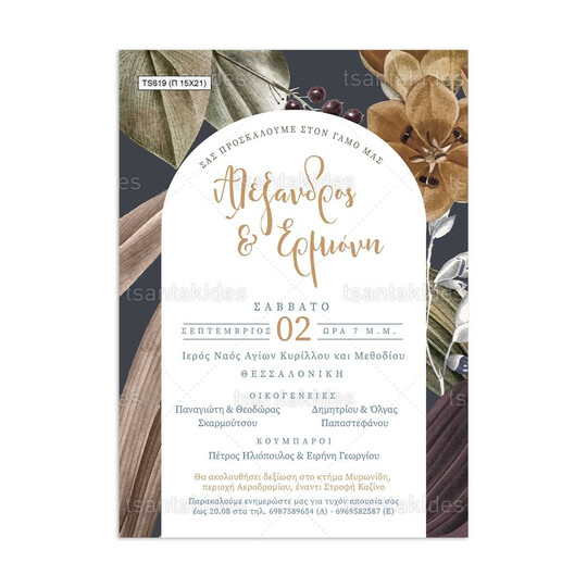 Προσκλητήριο γάμου παπυράκι εκτυπωμένο με θέμα bohemian ύφος και dried palm φύλλα