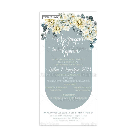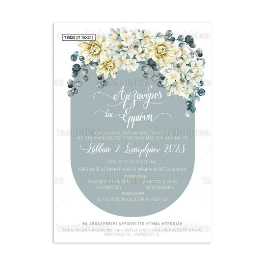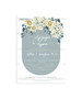 Προσκλητήριο γάμου παπυράκι εκτυπωμένο με θέμα dusty blue floral σχεδιασμό σε οβαλ