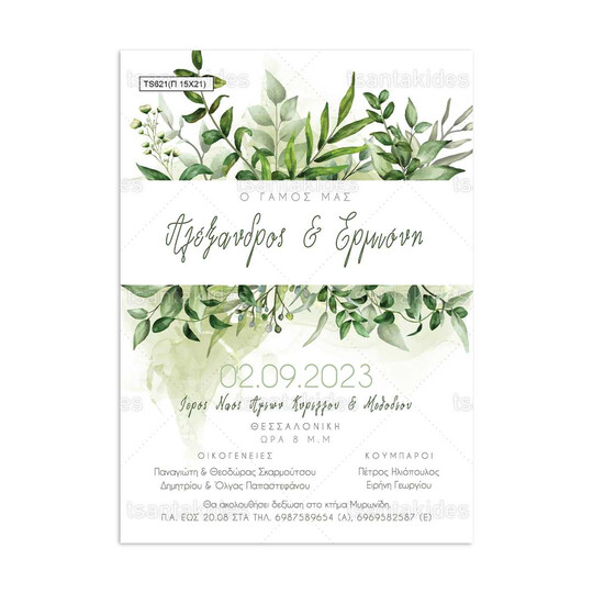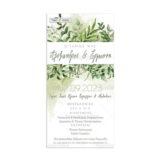 Προσκλητήριο γάμου παπυράκι εκτυπωμένο με θέμα greenery και στοιχεία από κλαδιά και ευκάλυπτο