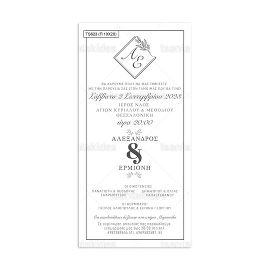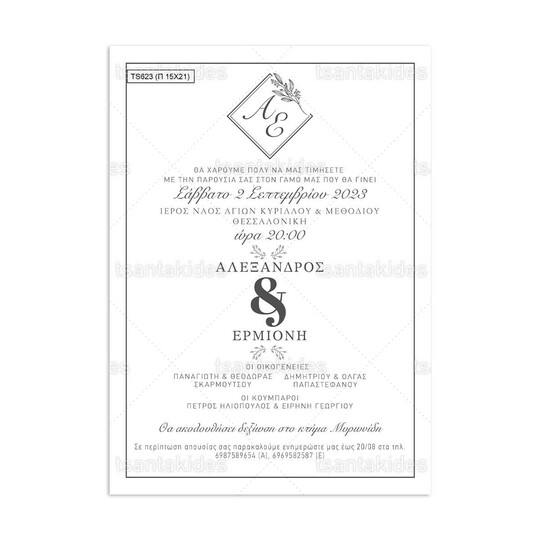 Προσκλητήριο γάμου παπυράκι εκτυπωμένο με θέμα γκρι αποχρώσεις και λογότυπο τα μονογράμματα με κλαδί ελιάς