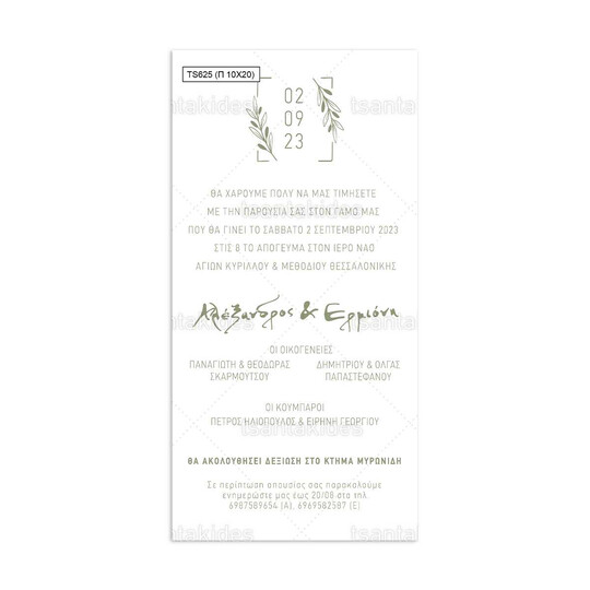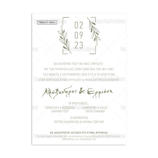 Προσκλητήριο γάμου παπυράκι εκτυπωμένο με θέμα λαδί αποχρώσεις και λογότυπο η ημερομηνία με κλαδιά ελιάς