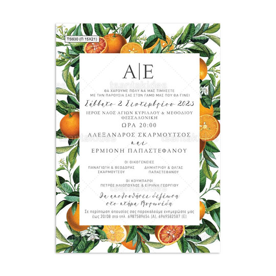 Προσκλητήριο γάμου παπυράκι εκτυπωμένο με θέμα σύνθεση από πορτοκάλια και λογότυπο μονογράμματα