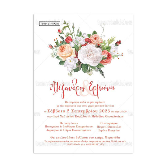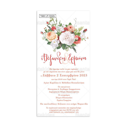 Προσκλητήριο γάμου παπυράκι εκτυπωμένο με θέμα floral ρομαντική σύνθεση με παιώνιες και τριαντάφυλλα