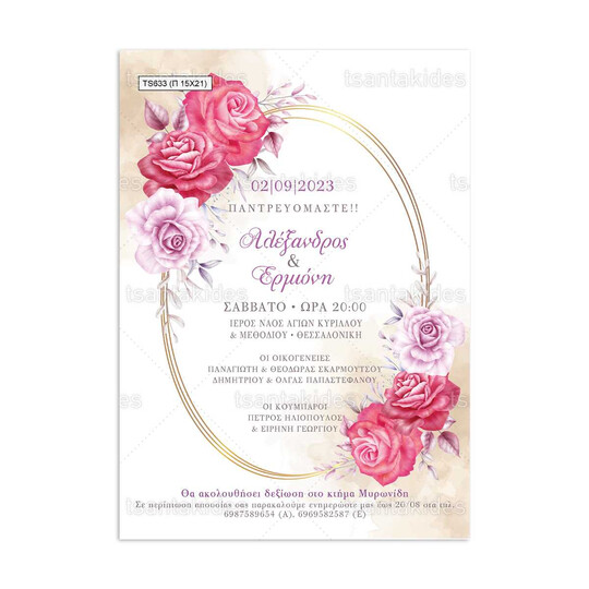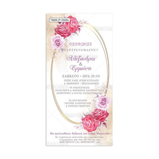 Προσκλητήριο γάμου παπυράκι εκτυπωμένο με θέμα floral σχεδιασμό και χρυσό οβάλ στεφάνι
