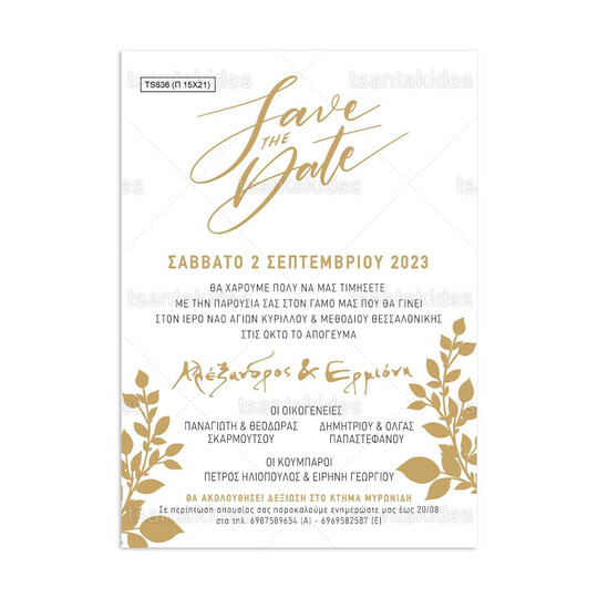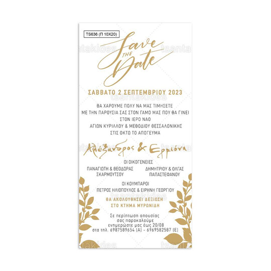 Προσκλητήριο γάμου παπυράκι εκτυπωμένο με θέμα λογότυπο save the date και γραμμικά gold κλαδιά