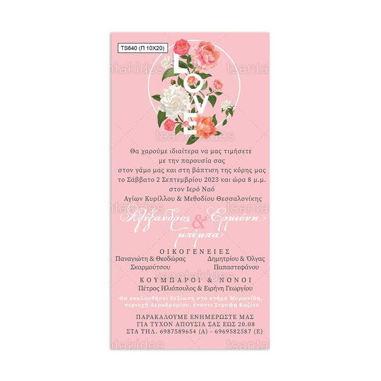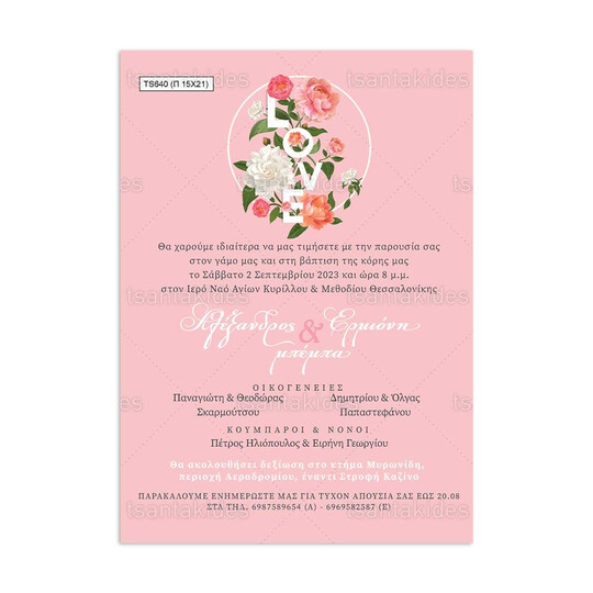 Προσκλητήριο γάμου παπυράκι εκτυπωμένο με θέμα λογότυπο LOVE με τριαντάφυλλα και ροζ backround