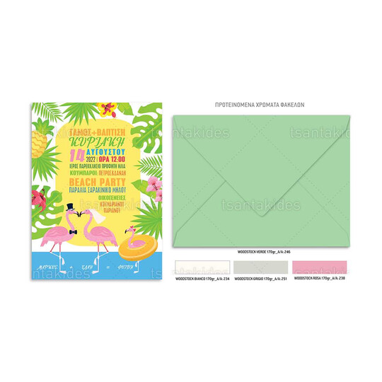 Προσκλητήριο γάμου και βάπτισης με θέμα Flamingo Summer Story. Η κάρτα του προσκλητηρίου είναι τυπωμένη σε λευκό ματ χαρτί 250 γρ. Το προσκλητήριο διαθέτει φάκελο διάστασης 19,5 x 14,5 εκ. σε χαρτί της επιλογής σας από τους αναγραφόμενους κωδικούς.