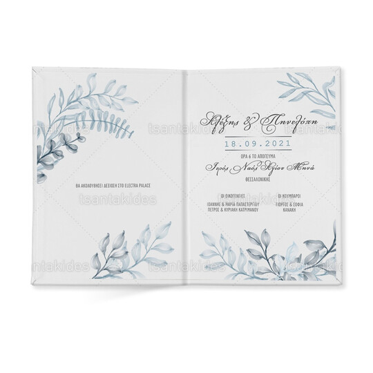 Προσκλητήριο σκληρό καπάκι μεγάλο εκτυπωμένο με λιτό σχεδιασμό και dusty blue στεφανάκι