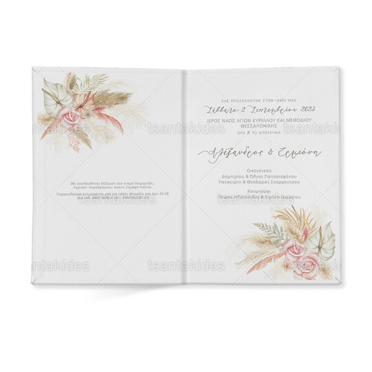 Προσκλητήριο σκληρό καπάκι  μεγάλο εκτυπωμένο με bohemian ύφος και pampas λουλούδια
