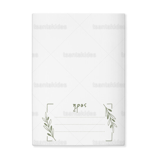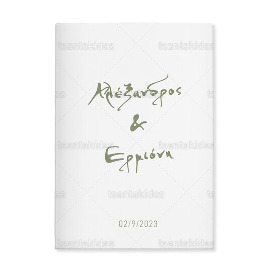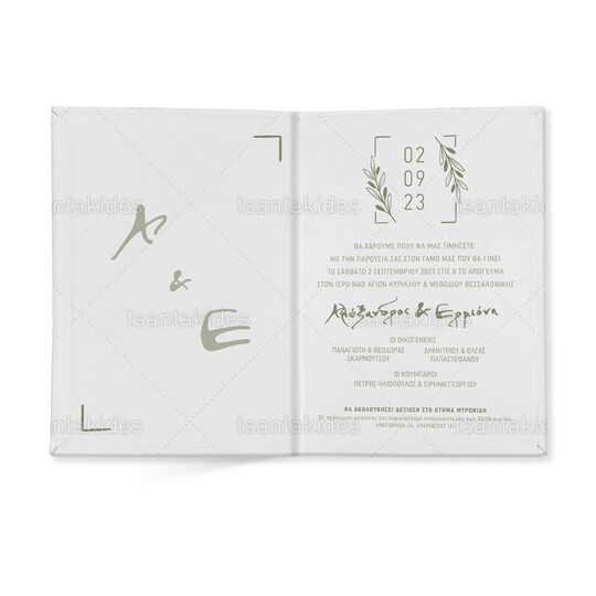 Προσκλητήριο σκληρό καπάκι μεγάλο εκτυπωμένο σε λαδί αποχρώσεις και λογότυπο η ημερομηνία με κλαδιά ελιάς