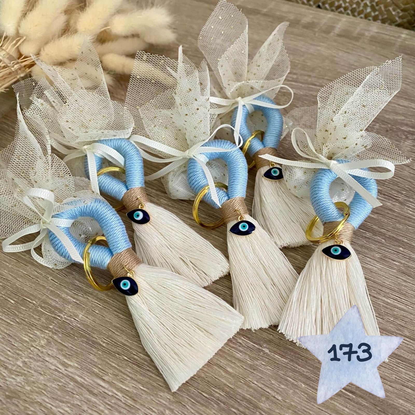 Κεράσματα γέννας μακραμέ μπρελόκ σε αποχρώσεις του μπλε με μεταλλικό ματάκι. Υπάρχει η δυνατότητα κατασκευής και σε άλλους χρωματικούς συνδυασμούς.