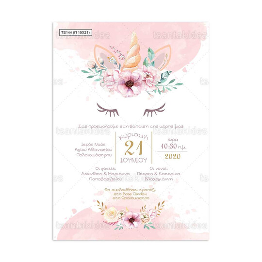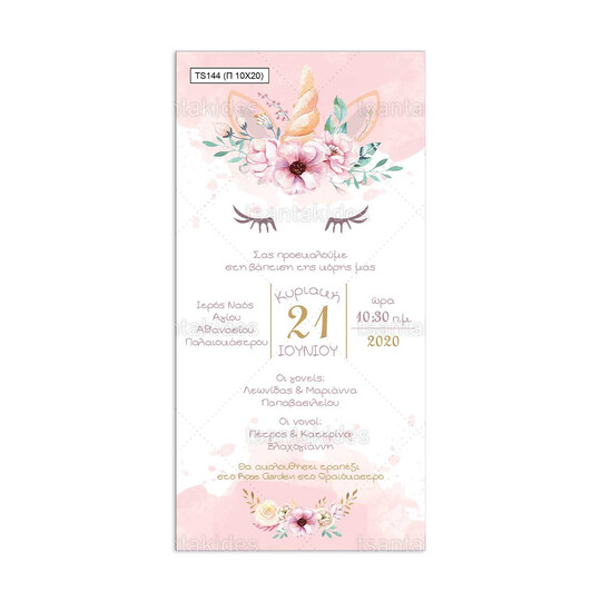 Προσκλητήριο βάπτισης παπυράκι εκτυπωμένο με θέμα το μονόκερο