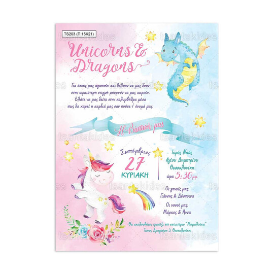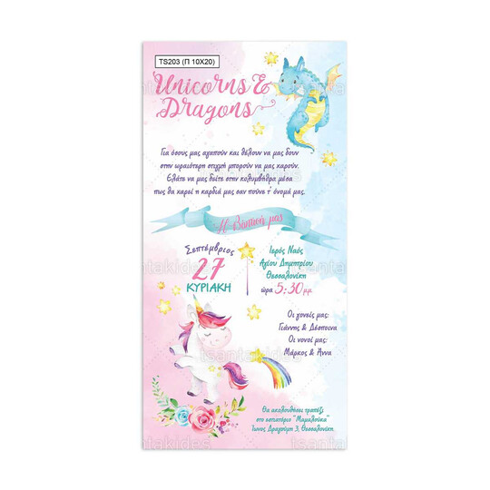 Προσκλητήριο βάπτισης παπυράκι εκτυπωμένο με θέμα το μονόκερο και το δράκο