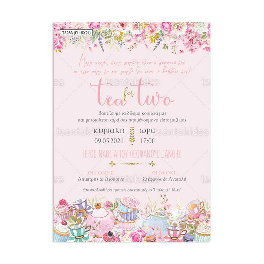 Προσκλητήριο βάπτισης παπυράκι εκτυπωμένο με θέμα shabby chic και teapot