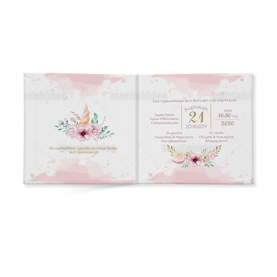 Προσκλητήριο σκληρό καπάκι,  παραμυθάκι μικρό, εκτυπωμένο με θέμα  το μονόκερο
