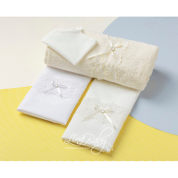 Aπόλυτη κομψότητα σε κάθε λεπτομέρεια: βαμβακερό σετ σε λευκό & εκρού, διακοσμημένο με φαρδιά δαντέλα κορδονέ, σατέν φιογκάκι και εμβληματικό κουμπάκι με στρας & πέρλα. Ένα σετ που συνδυάζει υψηλή αισθητική, φινέτσα και πολυτέλεια, ιδανικό για όποιον θέλει η βάπτιση να γίνει μια μοναδική, αληθινά λαμπερή στιγμή. Luxury details, unforgettable moments.