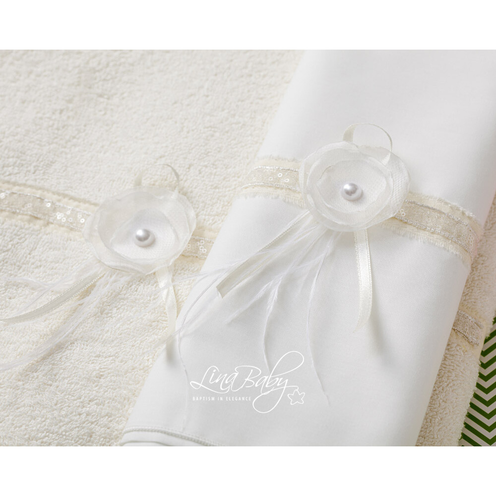 Sparkle under the sun... Erica... Υπέροχο βαμβακερό σετ λαδόπανων για κορίτσι σε εκρού χρώμα, με διακοσμητική τρέσα σε εκρού χρώμα και παγιέτες, χειροποίητο λουλούδι από ύφασμα, σατέν κορδέλα και φτερά.