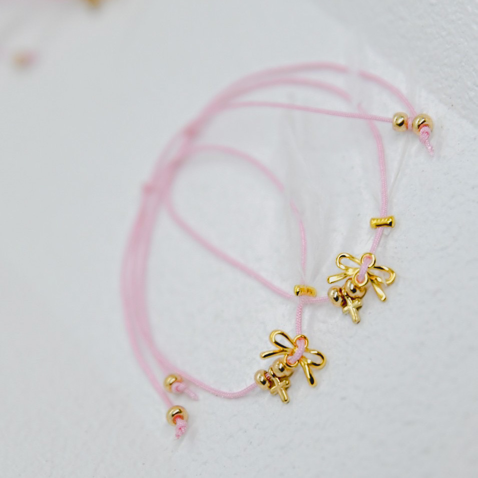 Μαρτυρικό βάπτισης για κορίτσι βραχιόλι με επίχρυσο στοιχείο φιογκάκι 24Κ και επίχρυσο σταυρουδάκι.