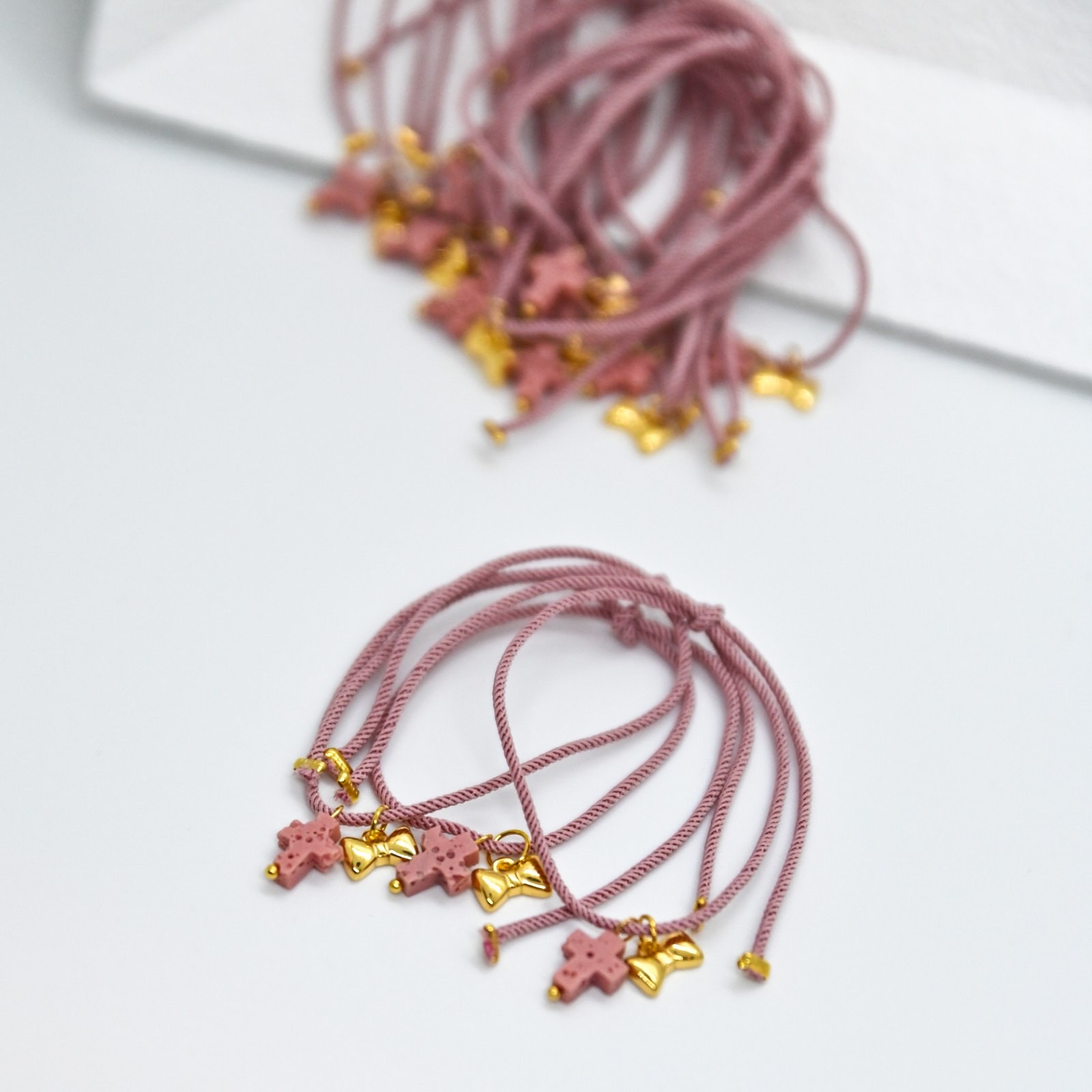 Μαρτυρικό βάπτισης για κορίτσι βραχιόλι με μεταξωτό κορδόνι, επίχρυσο στοιχείο φιογκάκι 24Κ και λάβα σταυρό.