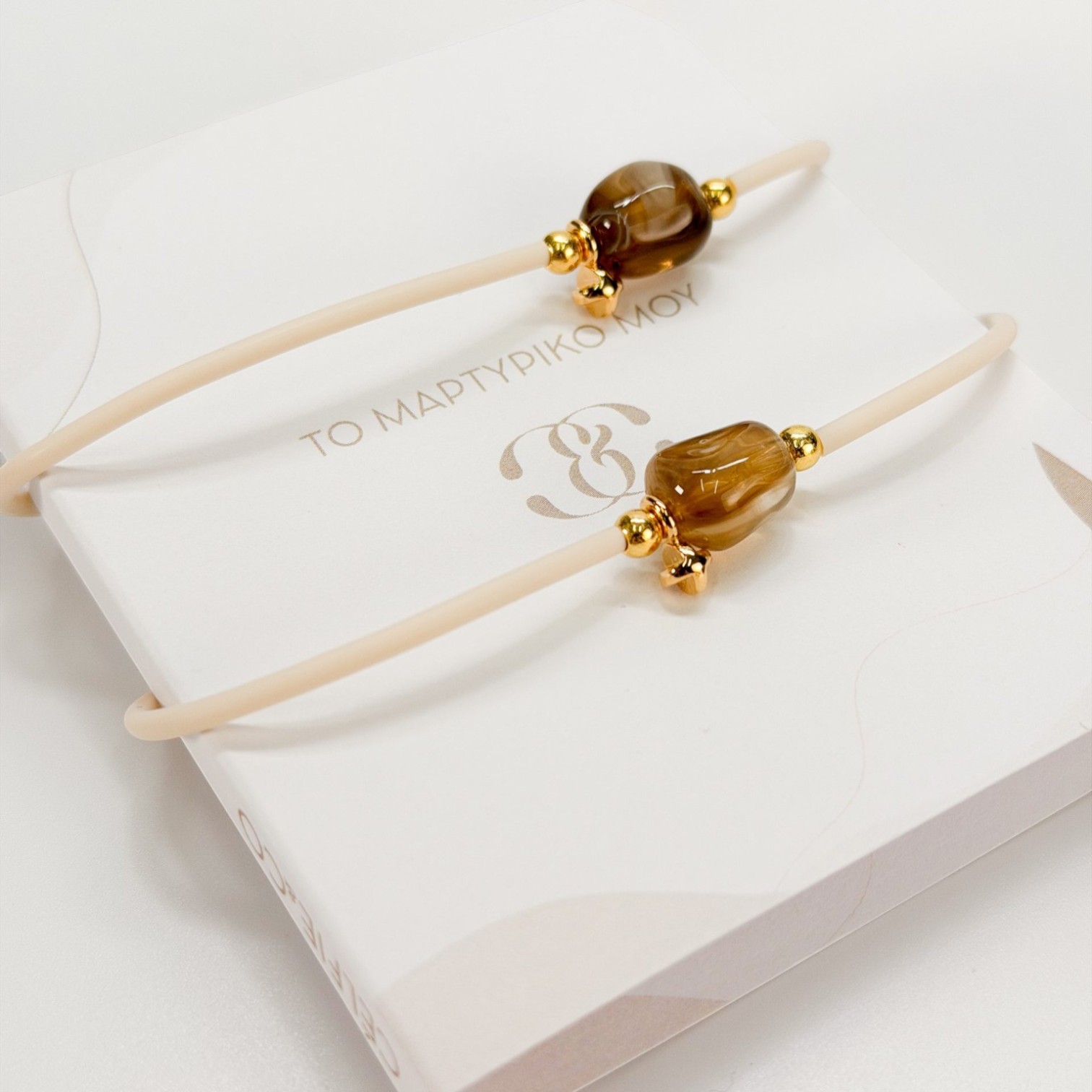 Η μοντέρνα αισθητική συναντά τα γήινα χρώματα σε ένα μαρτυρικό με άποψη! Το μαρτυρικό βραχιόλι της Celfie and Co (J-7) πρωτοτυπεί με τη χρήση εκρού κορδονιού από καουτσούκ, ένα υλικό που προσφέρει μοναδική άνεση και σύγχρονο look. Το κέντρο του κοσμείται από μια εντυπωσιακή καφέ δίχρωμη ακρυλική πέτρα, ενώ ο επιχρυσωμένος σταυρός προσδίδει την απαραίτητη λάμψη.