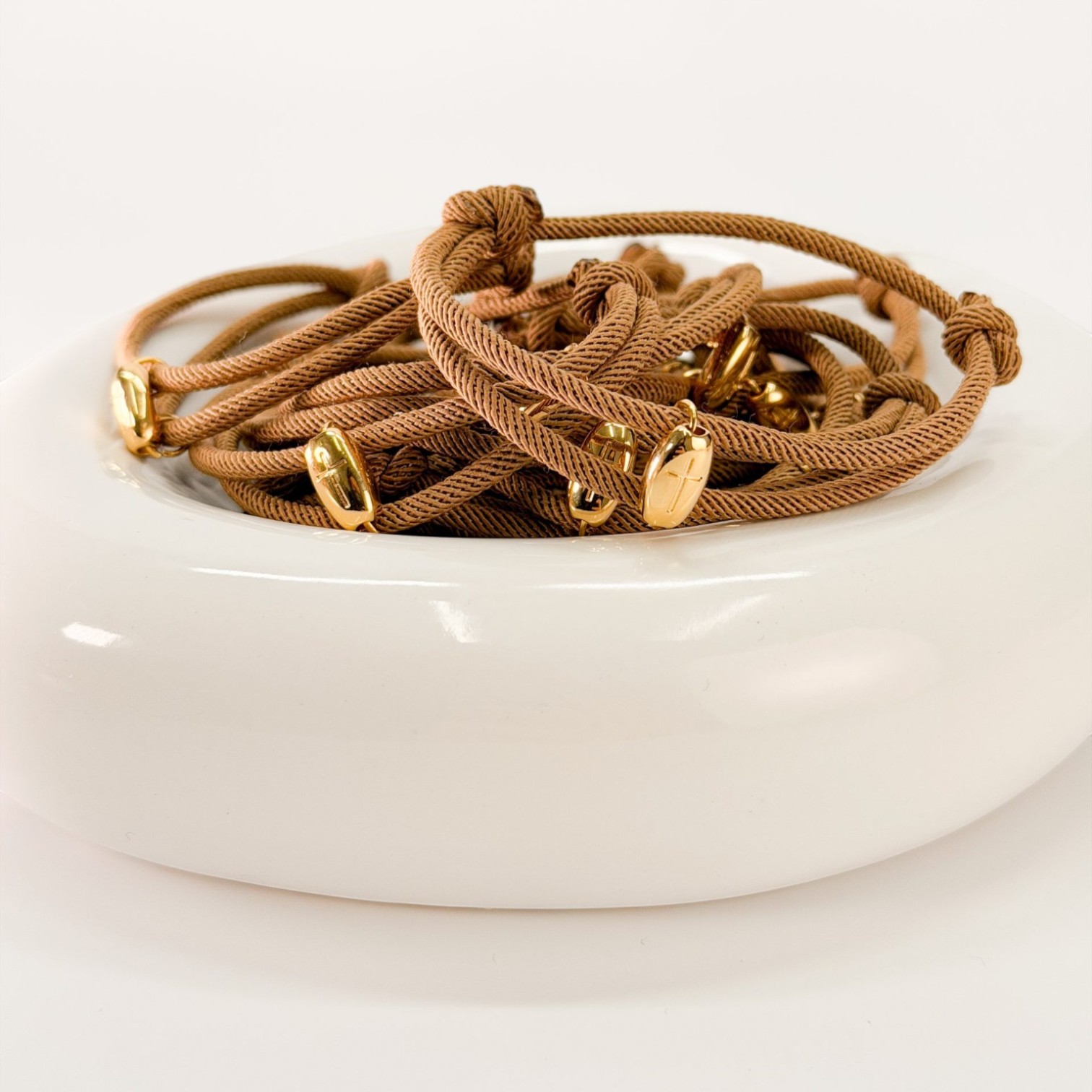 Το βραχιόλι διαθέτει ένα ιδιαίτερο στριφτό κορδόνι σε συνδυασμό καφέ και μπέζ αποχρώσεων, προσφέροντας μια "ζεστή" και οργανική αίσθηση. Στο κέντρο δεσπόζει ένας επιχρυσωμένος σταυρός υψηλής ποιότητας, ο οποίος προσθέτει την απαραίτητη λάμψη και κύρος στο μυστήριο.