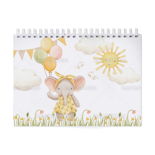 Παιδική μπομπονιέρα βάπτισης μπλοκ ζωγραφικής με διάσταση 21x29cm, εκτυπωμένο με θέμα Ελεφαντάκι Με Μπαλόνια.