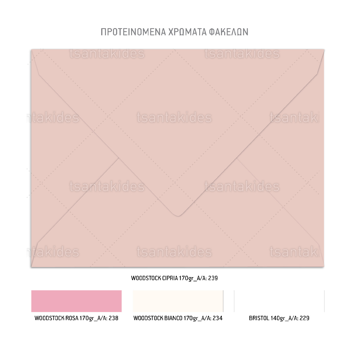 Η κάρτα του προσκλητηρίου είναι τυπωμένη σε λευκό ματ χαρτί 250 γρ. Το προσκλητήριο διαθέτει φάκελο διάστασης 19,5 x 14,5 εκ. σε χαρτί της επιλογής σας από τους αναγραφόμενους κωδικούς.