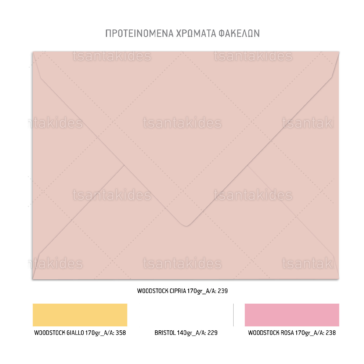 Η κάρτα του προσκλητηρίου είναι τυπωμένη σε λευκό ματ χαρτί 250 γρ. Το προσκλητήριο διαθέτει φάκελο διάστασης 19,5 x 14,5 εκ. σε χαρτί της επιλογής σας από τους αναγραφόμενους κωδικούς.